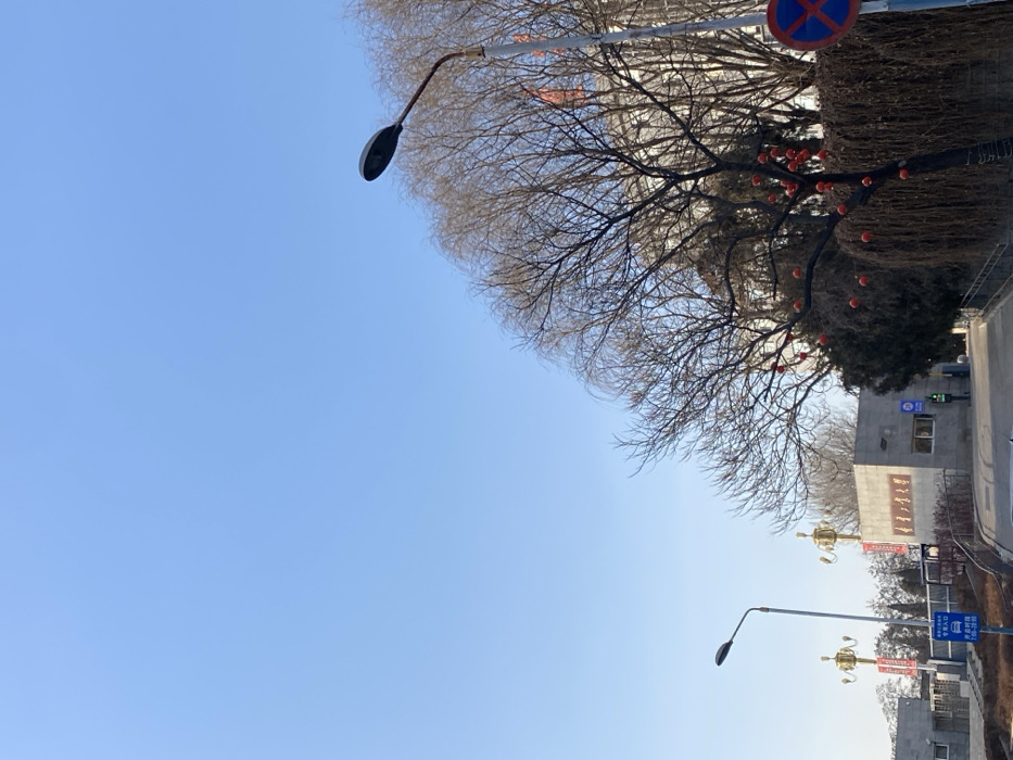 A partly cloudy blue sky dominates the frame. Bare tree branches reach across the upper right corner of the image. A street lamp is on the upper left and one on the bottom right. The right side features a sidewalk, buildings, and some trees decorated with red spherical objects. There is also a No Parking sign and a blue sign with white text.