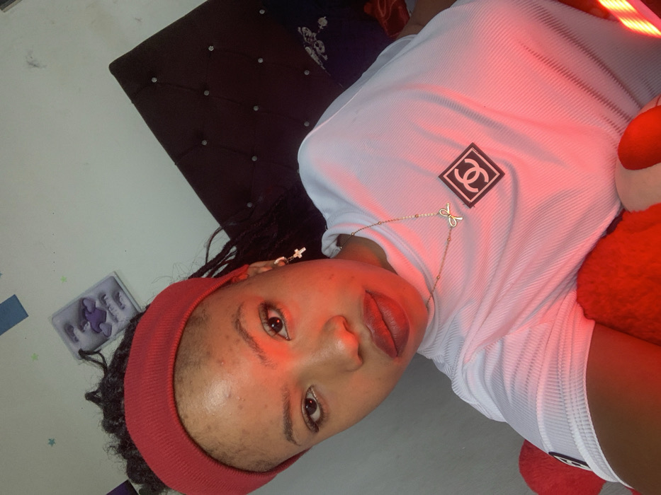 The scene is an indoor location in Lekki, Nigeria. A female individual, appearing to be a young adult, is featured in a close-up, selfie-style photograph. She has medium-brown skin, dark hair styled in dreadlocks or braids, and is wearing a red fabric headband. Her attire consists of a white ribbed short-sleeved top with a dark square logo, resembling a double 'C', positioned on the chest. Adornments include a gold-toned necklace with a bow-shaped pendant and a small hoop earring with a cross charm on her anatomical right ear. Facial makeup consists of dark eye makeup and red lipstick; minor blemishes are visible on her forehead and cheeks. The subject and immediate foreground are strongly illuminated by a red light source, casting a pronounced crimson hue across the image. In the background, a dark, tufted headboard is partially visible to the upper right. A light-colored wall behind the individual displays a light blue rectangular item, a grey textured object with heart-like indentations, and several faint star decals. A red plush object is partially visible in the lower left of the frame.