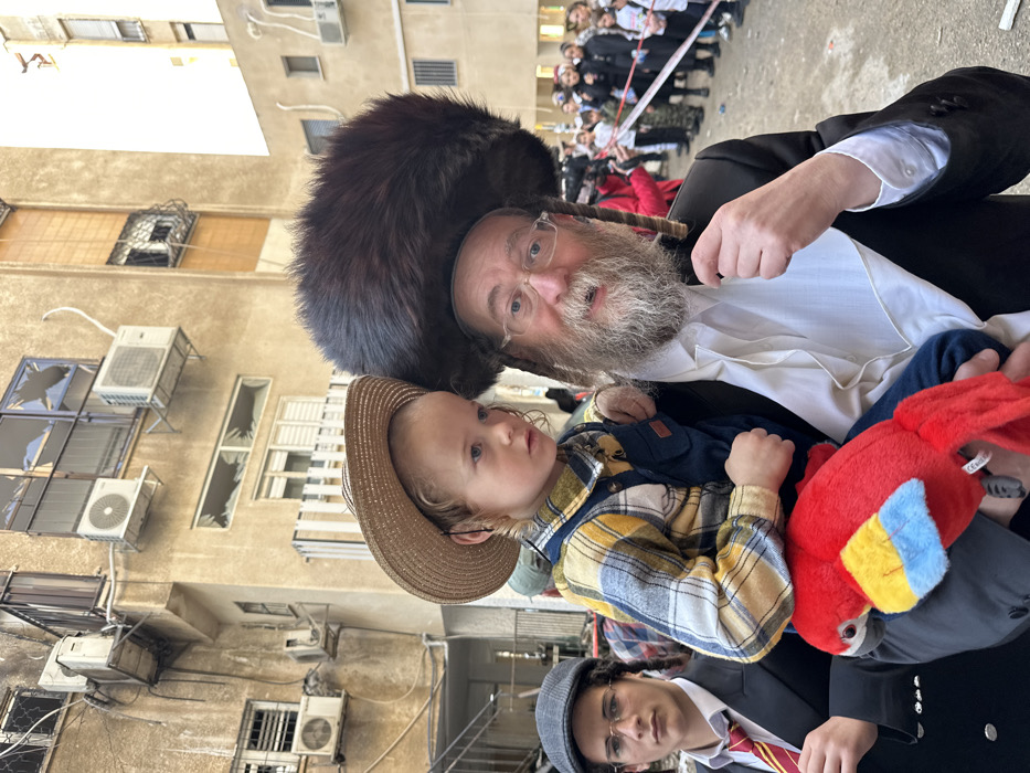 The image portrays an outdoor urban scene in Bnei Brak, Israel, under daylight conditions. In the central foreground, an adult male with a graying beard and side curls (peyot) wears a large, dark fur hat (shtreimel), clear-rimmed glasses, a black suit jacket, and a white ruffled shirt. He holds a young child on his left arm, looking directly at the camera with a slightly open mouth. The child, a blonde-haired toddler, wears a straw cowboy hat, a yellow and blue plaid shirt, and dark blue overalls. The child holds a red plush parrot toy with blue and yellow accents and gazes towards the viewer's right. To the left of the central figures, a teenage male with dark hair wears a dark grey flat cap, glasses, a dark suit jacket, a white shirt, and a red and yellow striped tie, also looking at the camera. The background consists of multiple stories of light-colored, residential buildings featuring numerous windows; several windows exhibit broken glass. Multiple white external air conditioning units are mounted on the building facades, with visible conduits. In the distant background, a crowd of individuals, including many children, is visible behind a red and white barrier tape to the right. The ground beneath the subjects appears to be a worn, paved or dusty surface.