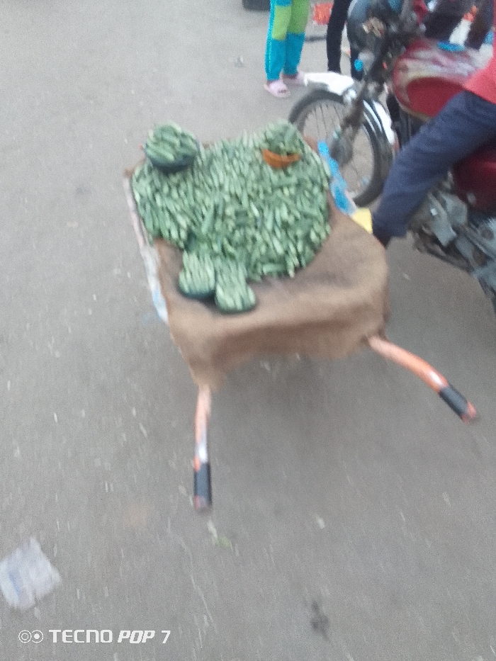 A blurred, eye-level shot captures a wheelbarrow filled with green okra. Some okra are piled in small bowls. The wheelbarrow has a brown cloth covering the inside. A motorcycle with a red seat is partially visible on the right. A person in blue and green patterned pants stands nearby. The ground is asphalt. The words "TECNO POP 7" are in the bottom left corner.