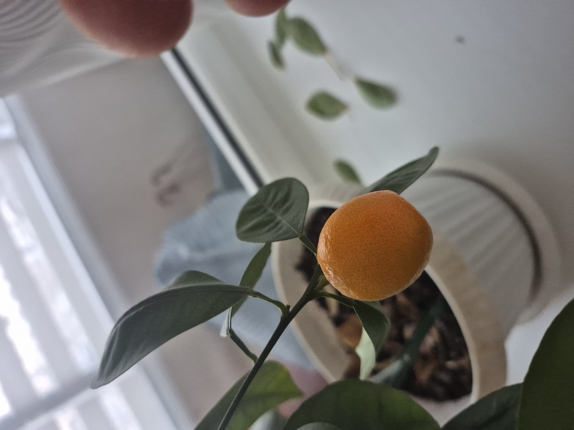 A low-angle shot shows a small, orange citrus fruit hanging from a potted citrus plant. The plant's leaves are dark green and glossy. The pot appears to be light-colored ceramic. The background is a blurred combination of a window with sheer curtains and a white wall. The location is likely indoors, based on the lighting and potted plant. The presence of a citrus plant suggests a domestic setting. There is no verifiable information to confirm the location is Chaikovsky, Russia.
