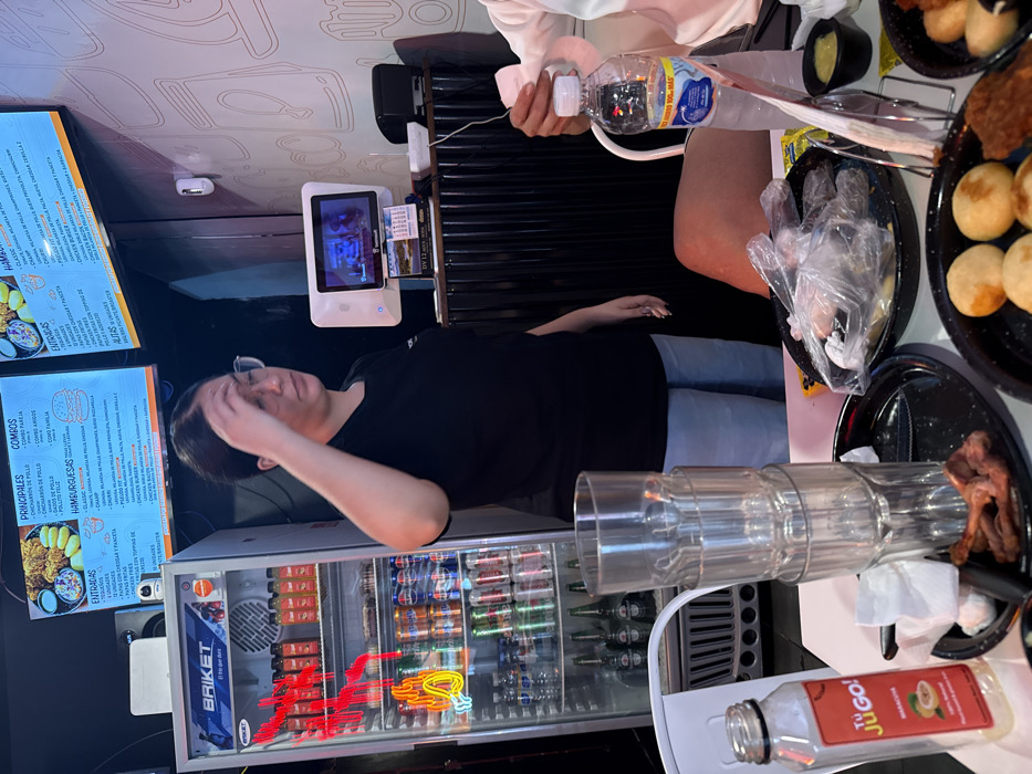 A restaurant interior features a cooler with soda and beer, menu boards advertising food, and a digital ordering screen. A person is seen standing near the cooler, while another is seated at a table with plates of food, glasses, and bottles of beverages. The scene includes details of the dining experience and the restaurant's offerings. The layout indicates a casual dining setting.