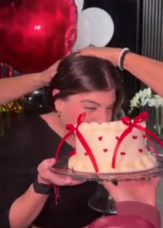 A young woman is being pushed face-first into a birthday cake by two other people, presumably friends or family. The cake is white, decorated with red hearts and red ribbon, and is on a glass cake stand. The woman is wearing a black top and has brown hair. Balloons in pink, red, black and white colors surround her. After the incident, she stands up with cake frosting on her face, laughs, and someone takes a photo with a phone. The background is a decorated interior, likely a home or party venue.