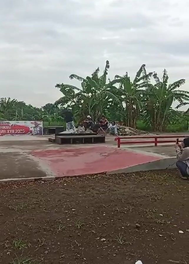 small outdoor skate park on a cloudy day. In the background is a banner that says "KEJUARAAN CABANG OLAHRAGA KUALIFIKASI PORPROV JAWA TENGAH XVII 2023". Several people are gathered around a central raised platform with ledges, apparently taking a break. A skateboarder in light-colored clothing is seen in motion on the left side of the frame, and another person is crouched on the ground to the right, seemingly recording with a mobile phone. The foreground consists of newly planted soil with sparse, small plants. In the background are several tall banana trees and other greenery.