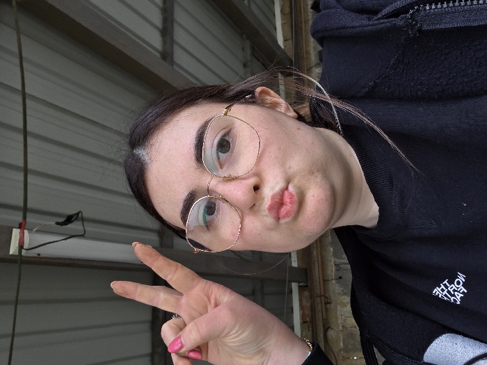 An image taken in Negorci, North Macedonia, depicts a female subject from the chest up, positioned centrally in the frame. The individual has dark hair with some lighter strands visible, and is wearing thin, gold-rimmed eyeglasses. Her lips are pursed in a "kiss face" gesture, and her gaze is directed slightly to the viewer's right. Her left hand is raised, performing a "peace sign" with the index and middle fingers extended; her fingernails are painted pink, and a ring is visible on her ring finger. She is wearing a black long-sleeved shirt, potentially a sweatshirt, with a partial white logo visible on the left side, and a black zippered jacket over it. The background consists of a grey corrugated metal ceiling with structural supports, and a white fixture with black wiring is visible in the upper left quadrant. A light-colored, possibly concrete or brick, wall section is partially visible behind the subject's right shoulder.