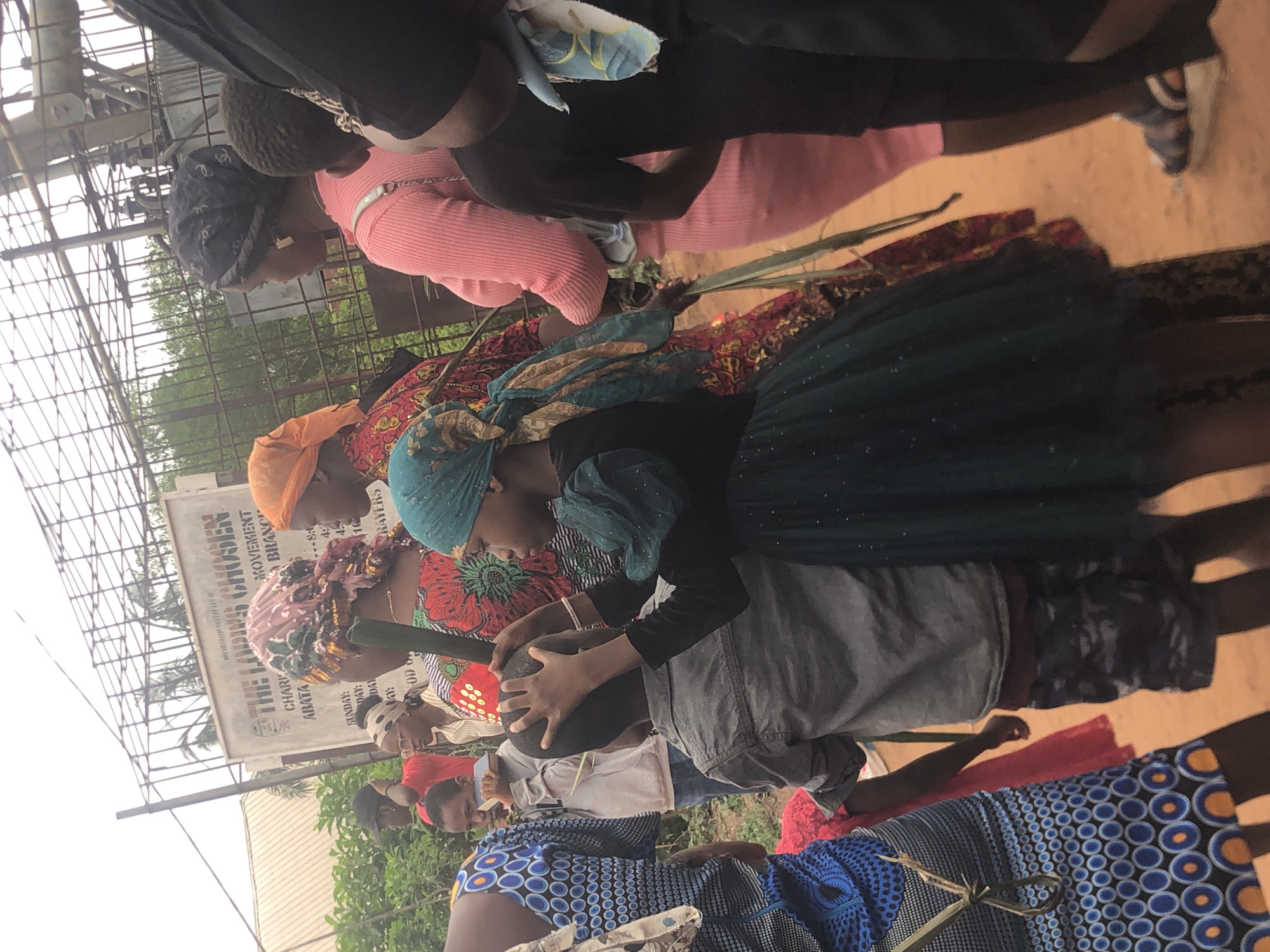 A group of women and children are lined up outside a building with a sign that reads "The Lord's Chosen Movement Branch" in Ukwu-Abwa, Nigeria. The women are wearing traditional African clothing and headwraps, and some are holding palm fronds. One of the children is holding a black object, possibly a musical instrument. The setting appears to be a church gathering.