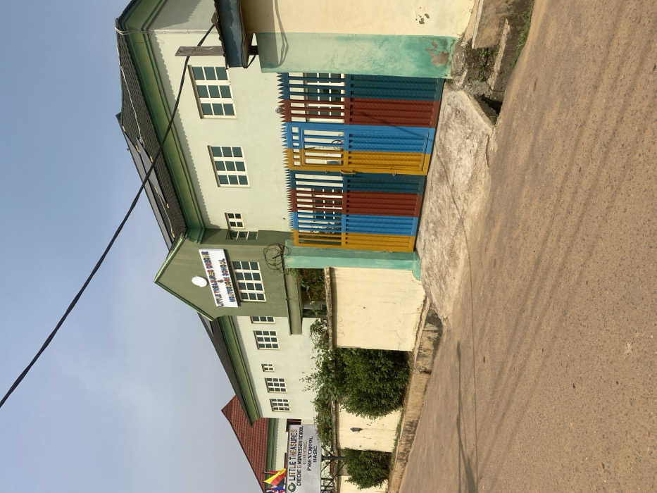 The image depicts the exterior of "LITTLE TREASURES CRECHE & MONTESSORI SCHOOL" located in Odo Ona, Nigeria
