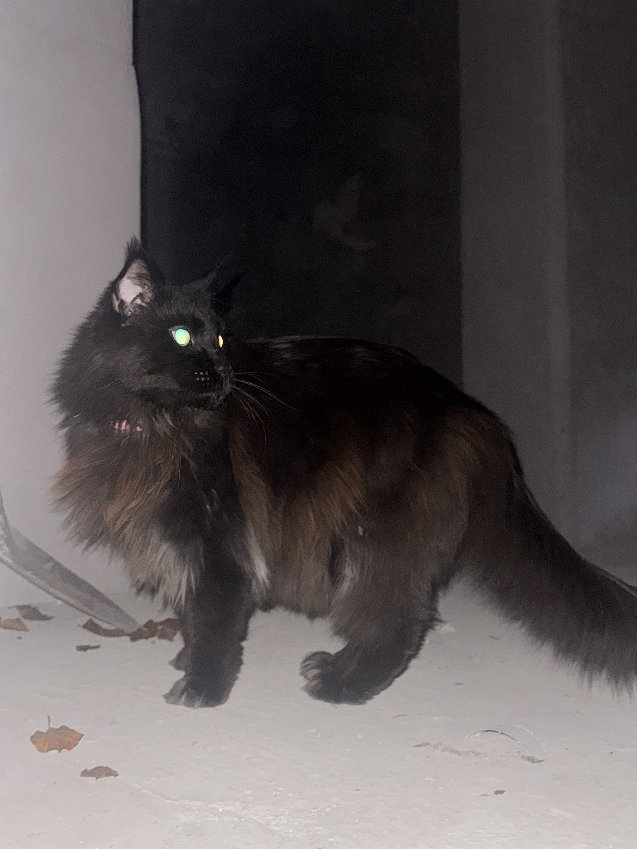 - "A long-haired dark brown cat with green eyes is standing on a light-colored surface with a leaf on it" by FM-SHEMl1, licensed under CC BY 4.0
