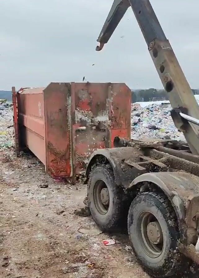 A garbage truck stands next to a large, orange dumpster in a landfill. The dumpster is placed at ground level. The truck's mechanical arm is visible, positioned above the dumpster but not actively engaged with it at this moment. The landfill is covered with debris, and the sky above is overcast.