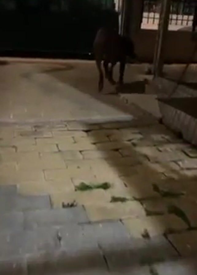 The video begins with a dark-coated dog standing on a gray brick surface. The dog abruptly barks and then starts walking towards the camera. It is a medium-sized dog, possibly a pit bull mix, with a white patch on its chest. As the dog approaches, it comes close to the camera, which is held by a person who steps backward. The video ends with a close-up of the dog's hindquarters as it moves past the camera. The setting appears to be an outdoor area, possibly a driveway or patio at night, with a building and a metal gate visible in the background.
