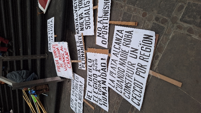 protest signs scattered on the ground. The signs are handwritten in Spanish, expressing anti-Yankee sentiments and socialist ideals. Slogans include "Fuera Yanquis de mierda!!" (Yankees get out of here!), "Nueva York socialista" (Socialist New York), and "El pueblo elegido es toda la humanidad" (The chosen people are all of humanity). Another sign criticizes opportunism. One sign reads "La plata alcanza cuando nadie roba / Construir un CECCOT por región". A person sits behind the signs.