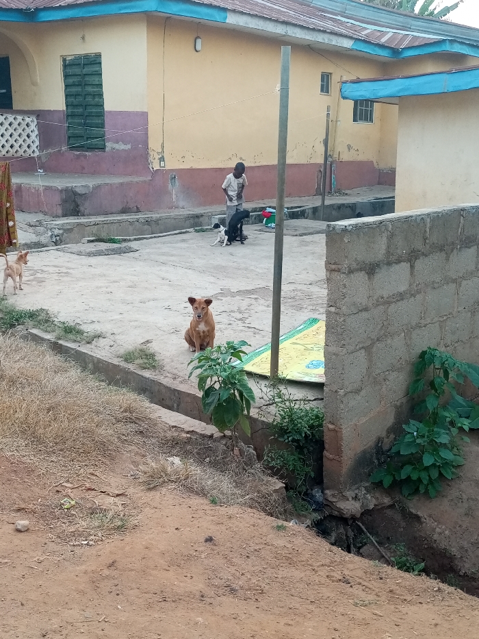 A sandy-colored dog sits in front of a ditch, between a concrete barrier and overgrown grass. The dog faces the camera, its ears perked. In the background, a light-skinned child plays with several dogs in a courtyard. The buildings are faded yellow and the roofs are corrugated metal. A clothesline is strung between two poles in the yard.