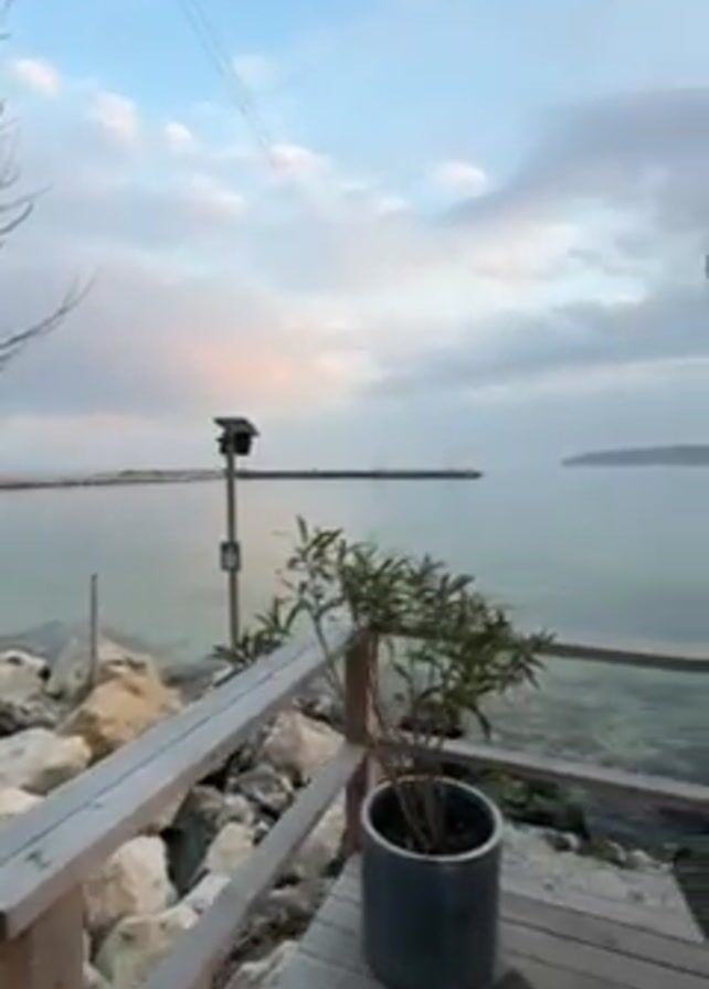 A video shows a seaside view at dusk