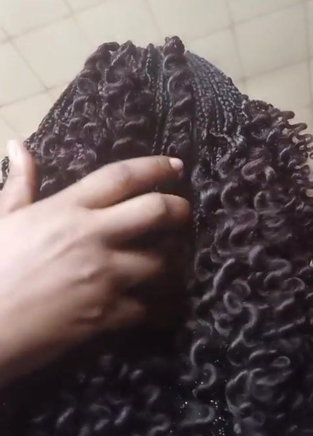 woman smiling at the camera. She is wearing a dark-colored top with a pattern of small, light-colored beads or sequins. Her hair is styled in dark, curly extensions with some braided sections. Her hand is near her face, and the background is a plain, light-colored ceiling.