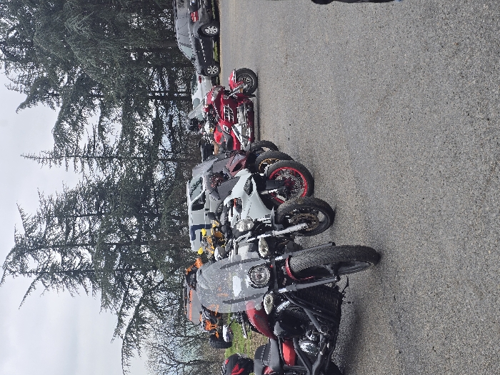 The scene depicts an outdoor parking area in the city of Chargan, Bulgaria, under an overcast sky. A line of six motorcycles is parked on a dark grey asphalt surface, extending from the lower left to the mid-right of the frame. The foremost motorcycle on the left is a red and black cruiser with a clear windshield and a single round headlight. Following it in sequence are a black standard motorcycle, a white sportbike with red wheel accents, a large red touring motorcycle featuring a prominent fairing and chrome details, and two additional partially obscured motorcycles. In the midground, behind the motorcycles, a white panel van, a dark-colored SUV, and other passenger vehicles are visible. To the left of the white van, an orange and black off-road vehicle is partially visible on a grassy incline. The background is characterized by numerous tall, dark green coniferous trees beneath a uniform light grey, cloudy sky. No individuals are clearly discernible within the frame.