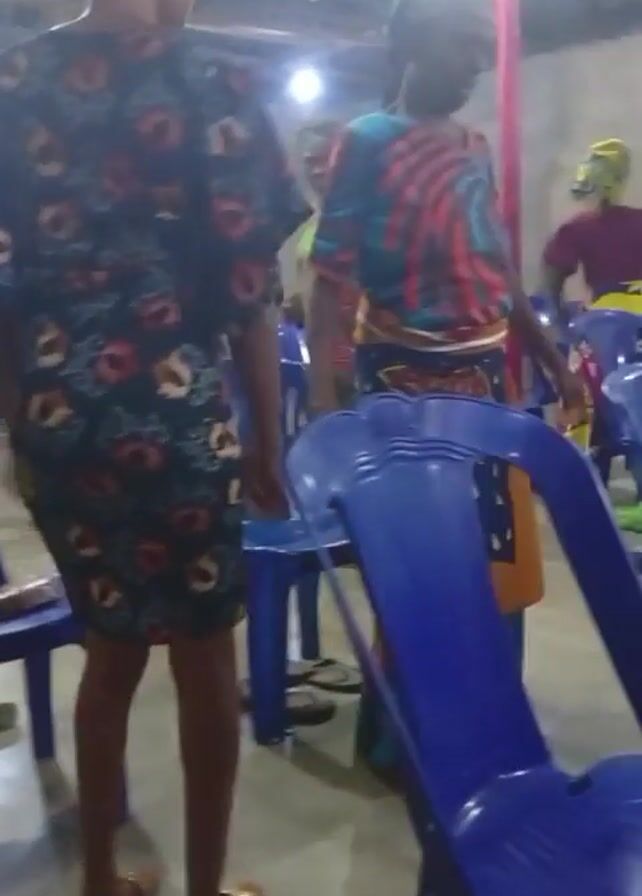 women standing and sitting in a room filled with blue plastic chairs. Most of the women are wearing colorful, patterned dresses, and some have headwraps. The room has a simple, informal appearance, possibly a community hall or church. Overhead lights are on. No specific actions or interactions are evident besides the women being present.