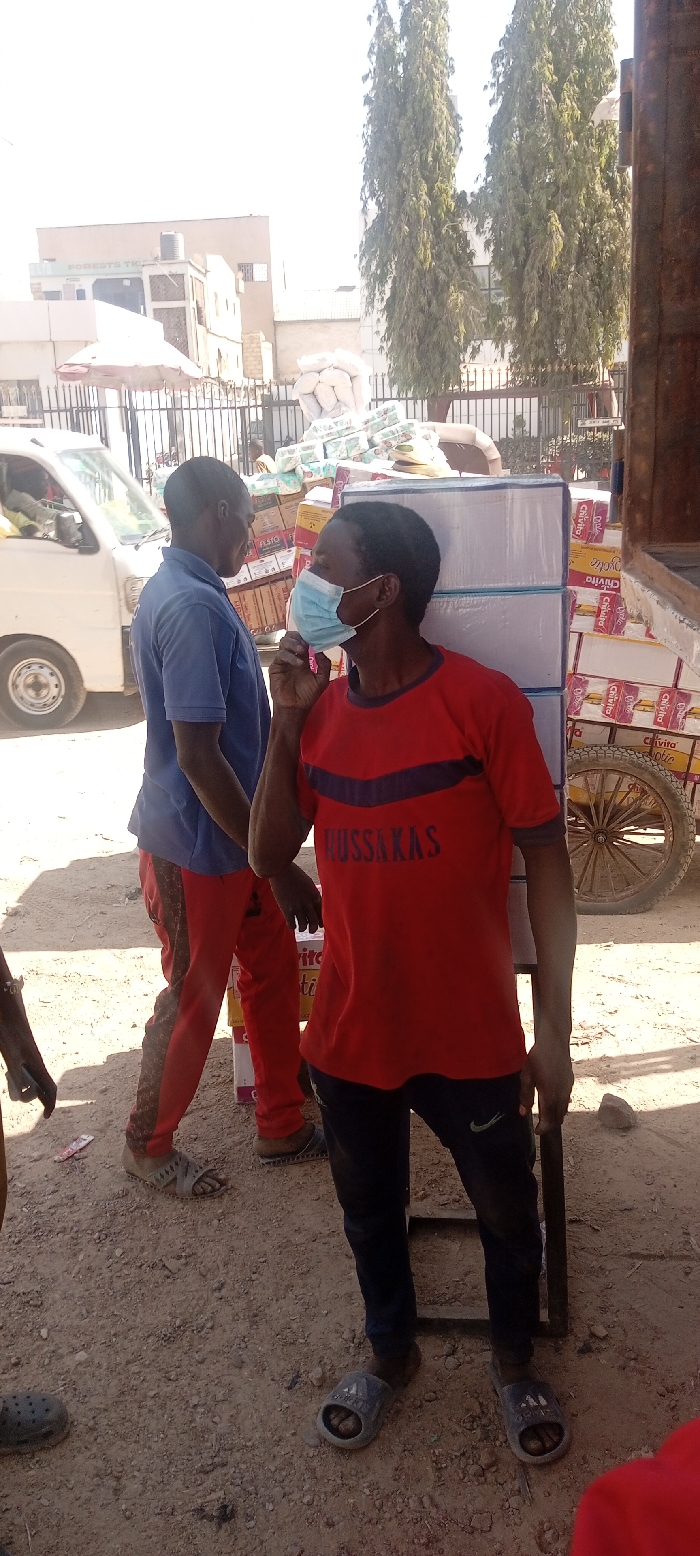 This image captures an outdoor, unpaved commercial area in Fagge C, Nigeria, under bright daylight. The scene depicts loading or unloading activity. In the foreground, a Black male subject stands facing left, wearing a red short-sleeved shirt with "HUSSAKAS" printed in dark letters across the chest, dark blue or black trousers with a green Nike swoosh logo on the left thigh, and grey Adidas slide sandals. He wears a light blue medical face mask, which is partially lowered, exposing his nose. He carries a vertical stack of three white, shrink-wrapped packages balanced on his right shoulder and upper back, with his left hand near his ear. To the subject's immediate left, a second Black male individual stands, partially obscured and facing towards the first subject. He wears a blue short-sleeved shirt, red track pants with a dark patterned stripe, and grey slide sandals. In the midground, a white commercial van is partially visible on the left. Behind the individuals, numerous packaged goods are stacked, including boxes labeled "FESTO" and "Civita," along with white, plastic-wrapped bundles, likely diapers or similar products. The wooden-spoked wheel of a handcart or trolley is visible on the right. The background features multiple multi-story buildings, some with external water tanks, behind a metal fence. Two tall, slender trees with dense green foliage rise above the fence line. The ground is dry, light-brown earth with scattered debris.