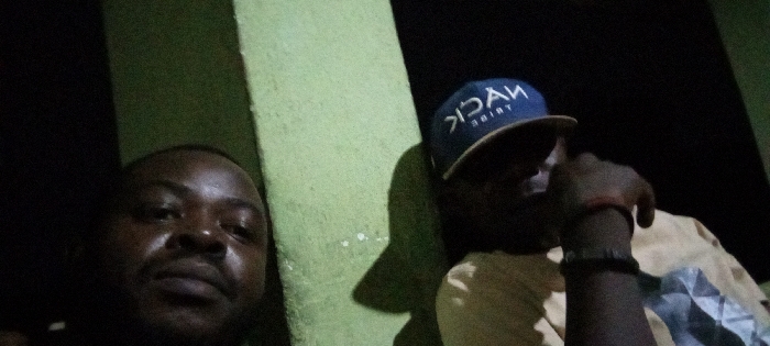 Two dark-skinned men are positioned in front of a green and black background. The man on the left is facing the camera. The man on the right is wearing a backward blue cap with white lettering. He has a watch on his left wrist and is holding his left hand up to his mouth. He is wearing a light-colored, patterned shirt. The image is slightly blurry.
