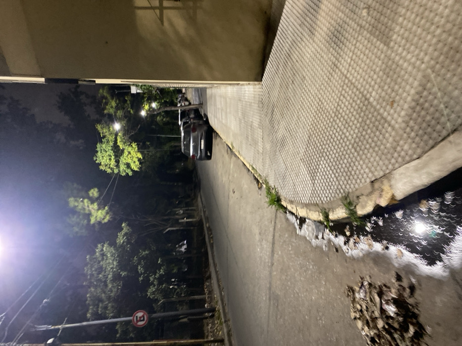 A street at night with a narrow sidewalk made of patterned tiles. A car is parked along the street. Trees and streetlights are visible on the left side. There is a wet patch and debris near the curb on the right. A no parking sign is seen towards the bottom left. The perspective gives the impression of looking down a narrow alley.
