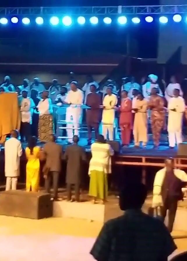 A group of people are standing on a stage. The stage is lit with blue lights. Most of the people are wearing white or light-colored clothing, and some wear colorful traditional outfits. There are a few people standing in front of the stage, looking up at the group. They are dressed in darker colors. The setting appears to be an outdoor event at night. There are lights strung above the stage, suggesting a performance or gathering.