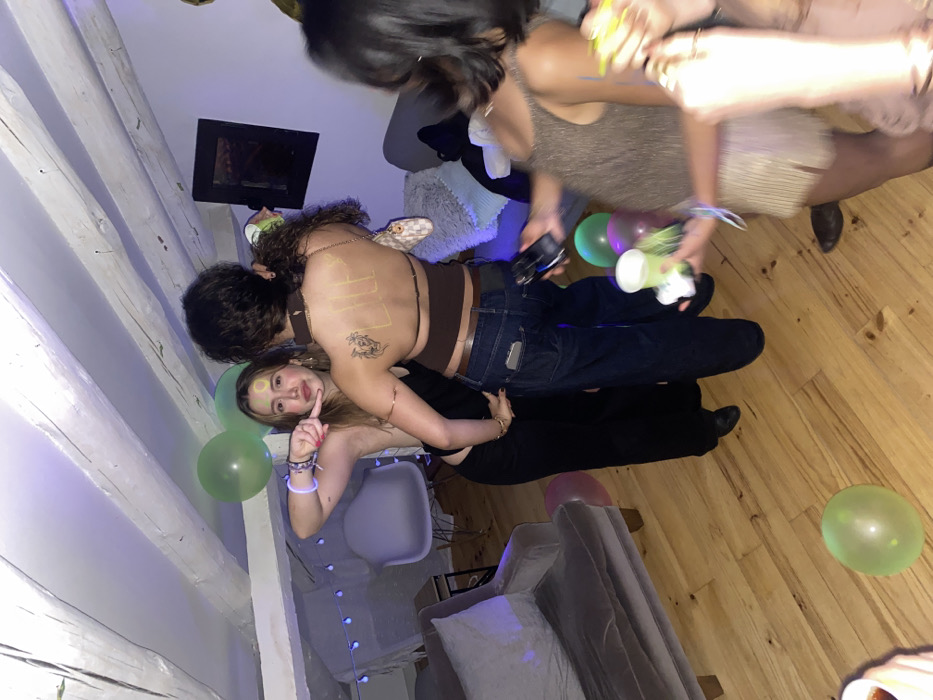 three young women in a room with wood floors and a white ceiling with exposed beams. The women are dressed in casual attire and appear to be having a good time. One of the women is pointing at a yellow inscription on another woman's back that reads "LEEP." There are multiple green and yellow balloons scattered on the floor. The room also has a couch with gray fabric and two large pillows, and a small table with what appears to be a plastic cup on it. The scene is lit by a string of white Christmas lights hanging on the wall behind the couch. The location is a room in a house located at 40.95 degrees latitude and -4.125 degrees longitude, which is within the city of Segovia, Spain.