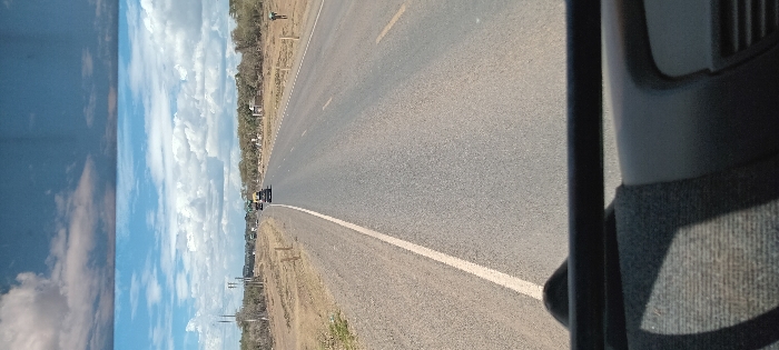 A long, straight asphalt road stretches into the distance under a bright, cloudy sky. Dry, grassy land borders each side of the road, sparsely dotted with small trees. In the distance, vehicles are visible on the road. Part of the vehicle interior, including a seat, a black pole, and a grey dashboard, occupies the right edge of the frame, suggesting the photo was taken from inside a vehicle.