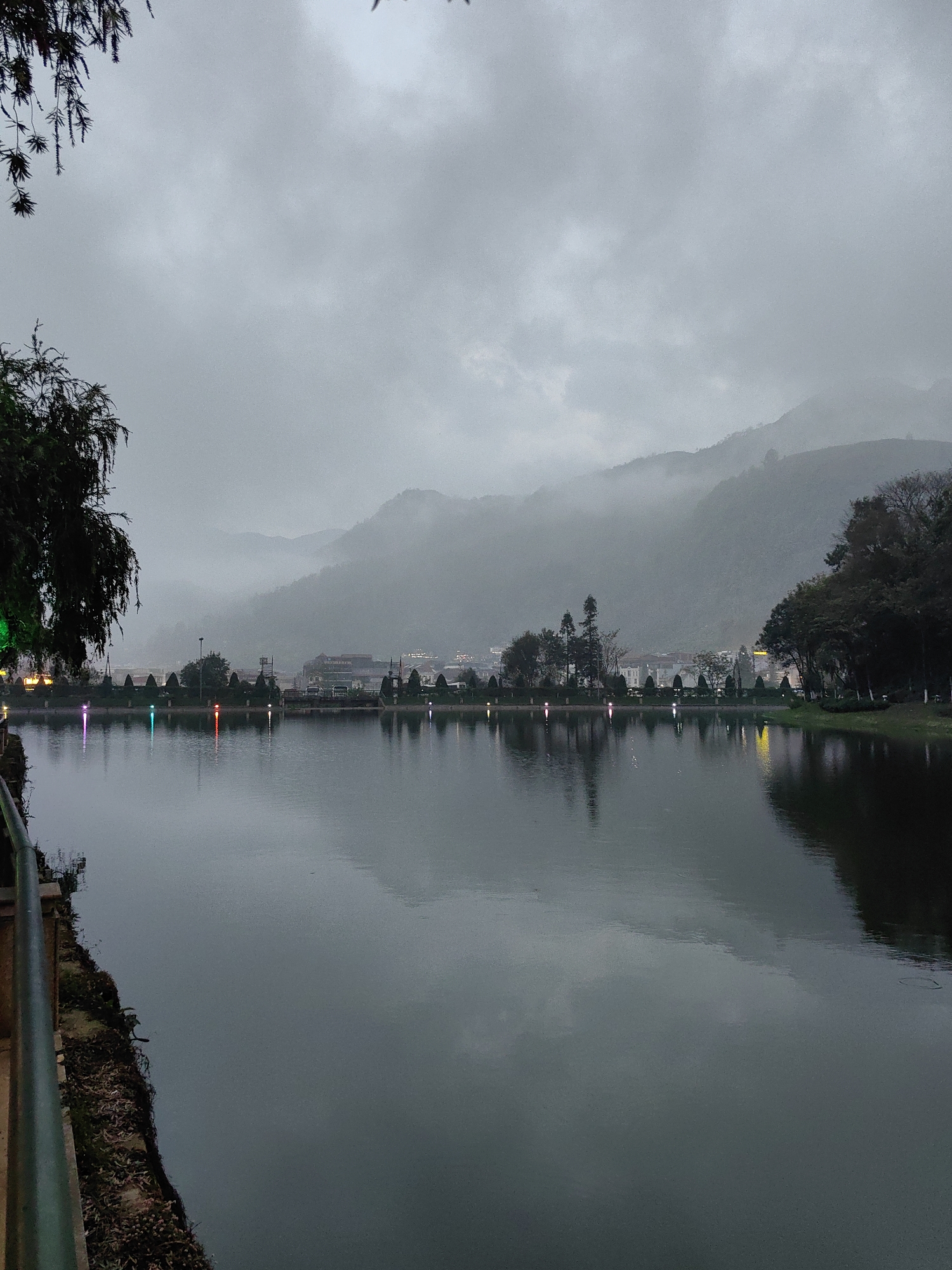 This image displays Sa Pa Lake in Sa Pa, Vietnam, under an overcast sky. In the immediate foreground on the left, dark, drooping branches of a tree with fine leaves partially obscure the upper and lower left corners. A dark, metallic railing follows the edge of a vegetated bank that borders the lake on the left. The still, dark grey surface of Sa Pa Lake dominates the midground, reflecting the uniformly grey, cloudy sky and multiple colored lights from the opposite shore. Across the lake, a promenade is visible, lined with regularly spaced ornamental shrubs and trees, some sculpted into conical shapes. Interspersed along this promenade are streetlights or decorative fixtures, casting distinct red, green, blue, yellow, and white reflections onto the water's surface. Behind the promenade, a cluster of buildings, varying in size and architectural style, is discernible. Some of these structures exhibit illuminated windows or signage. In the background, a series of steep, verdant mountains rises, partially enveloped and obscured by atmospheric mist and low-hanging clouds, creating a hazy, layered appearance that blends into the uniform grey sky above. No individuals, explicit actions, or interactions are depicted within the scene.
