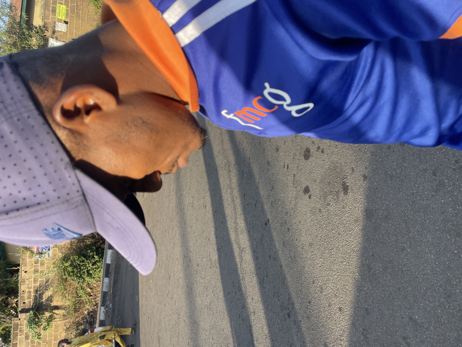 An image taken on an asphalt road in Barakin Lerawi, Nigeria, depicts a male individual in the foreground right, shown in profile, looking downwards. He wears a light purple baseball cap with a blue Nike logo and a blue long-sleeved shirt featuring an orange collar and white shoulder stripes. The word "fmcg" is printed vertically on his left chest in orange and white. Sunlight illuminates the right side of his face, casting shadows. In the far-left background, another individual dressed in a long, light yellow garment walks away from the viewer on the asphalt. Parallel shadows extend across the road surface. A low stone wall and green foliage are visible beyond a curb on the left side of the road. A sign, possibly indicating "ADMISSION," is affixed to a building wall in the distant background right.
