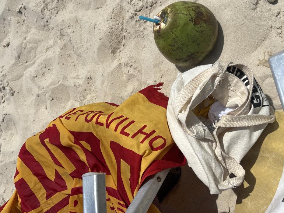 A beach scene shows sand, a green coconut with a blue straw, a beige tote bag with dark markings, and a fringed yellow towel with red lettering