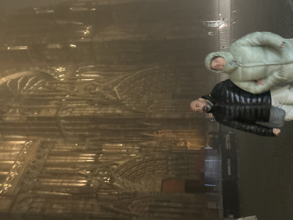 The image displays a nighttime scene in front of the illuminated Cathédrale Notre-Dame de Strasbourg, France, under hazy or foggy conditions. The Gothic cathedral's ornate facade, characterized by multiple pointed arched entrances and intricate stonework, is bathed in warm, golden artificial light. In the immediate foreground, two individuals walk from right to left, arm-in-arm. The male subject, positioned on the left, has a bald head, a dark beard, and a mustache. He wears a dark, possibly black, puffer jacket, light-colored trousers, and a grey cross-body bag slung over his left shoulder. His right hand is visibly clenched. The female subject, on his right, wears a light green or mint-colored puffer jacket with the hood drawn up around her face. Her right arm is linked with the male's left arm. The ground appears paved and damp. In the middle ground, near the base of the cathedral, dark temporary barriers are visible. One barrier to the left displays a partially visible white inscription, "LUMINOSITY." A small, dark, tent-like structure is situated behind this barrier. Further right, additional metal barriers are present, partially obscured by the atmospheric haze.