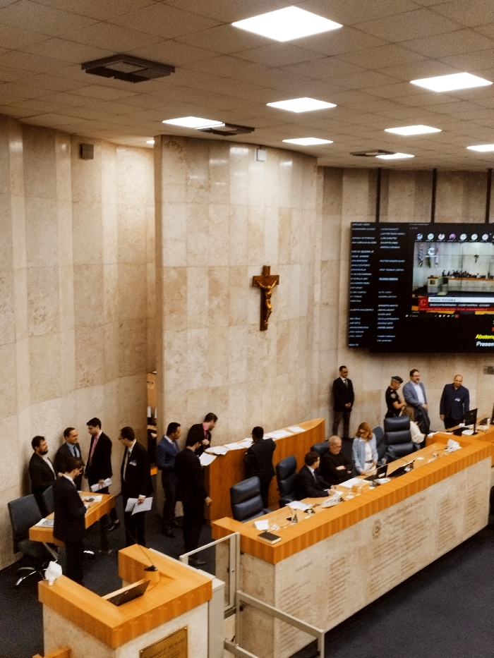 Inside a large chamber, numerous individuals dressed in formal attire stand or are seated around a prominent desk structure. A crucifix adorns the wall alongside a large screen displaying text and video. The room has high walls constructed of light-colored, patterned stone. Overhead, several square lighting fixtures illuminate the scene. The space appears to be a governmental or official assembly setting.