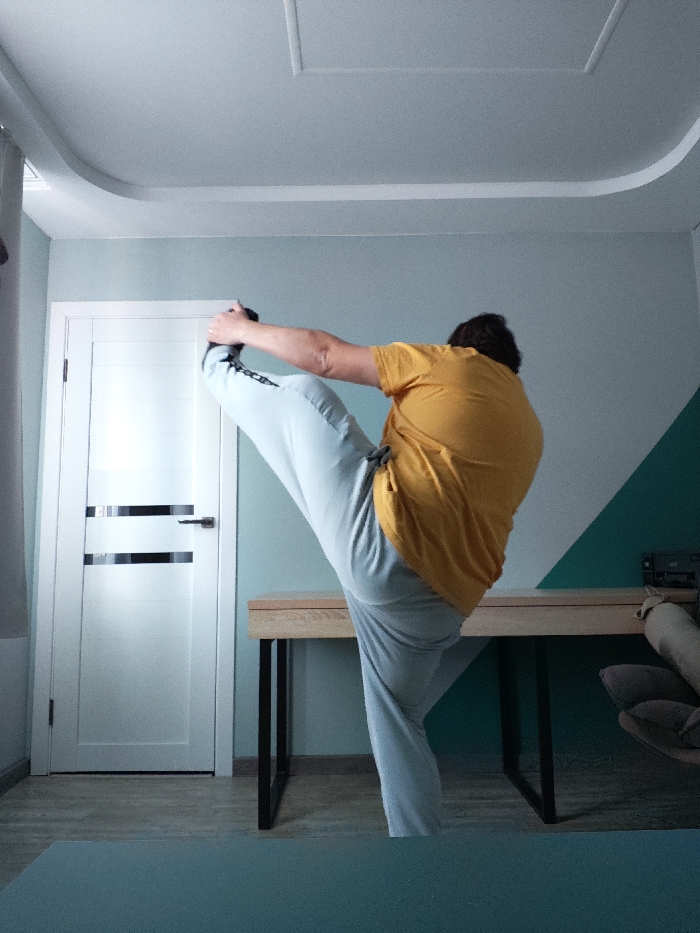 The scene is an interior room within the city of Unknown, Unknown. A single individual, with their back partially turned towards the camera, performs a deep vertical stretch. They wear a mustard yellow short-sleeved t-shirt and light grey track pants with a black stripe detail on the outer seam of the right leg. The individual's right leg is extended vertically upwards, with both hands grasping the right foot/ankle. The left leg appears to be the standing support, largely obscured by the foreground. The room features light blue-green walls, with a geometric dark teal triangle pattern on the upper right portion of the background wall. A white modern interior door with three horizontal frosted glass panels and a black handle is visible on the left. A light wood-colored desk with black metal legs stands against the wall on the right. A dark electronic device is placed on the desk's surface on the far right, next to a partial view of a gray upholstered chair. The ceiling is white with a curved edge molding on the left and a rectangular recessed panel near the center. The floor, partially visible at the bottom, is light-colored, with a dark blue-green mat or surface in the immediate foreground.