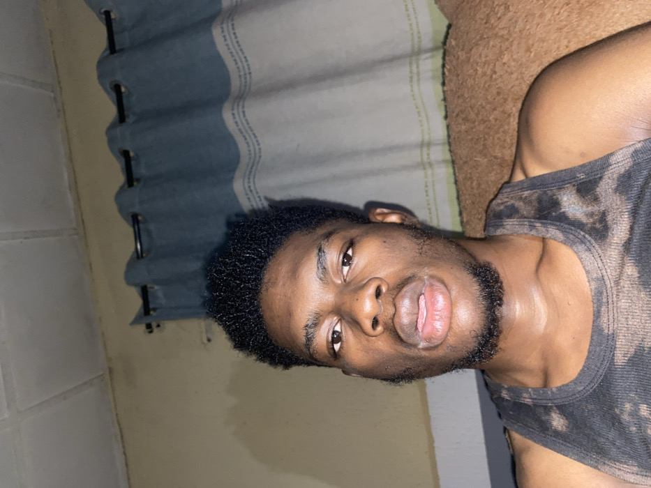 A close-up photograph captures a young Black male, approximately 20-30 years old, looking directly into the camera