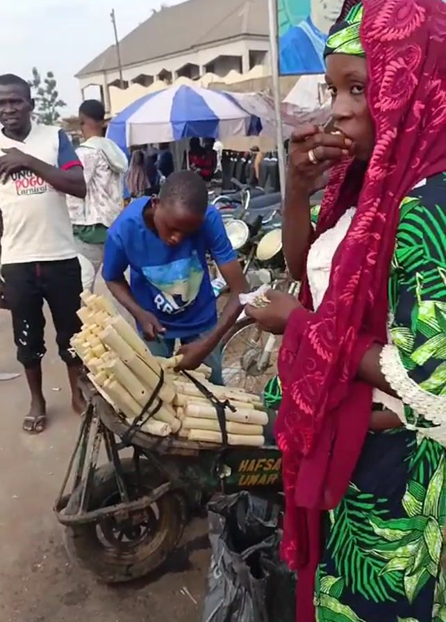 busy street scene. A person in a blue shirt is cutting sugar cane from a pile on a small cart with a large knife. The cart has the name "Hafsat Umar" written on it. A woman in a colorful green and black patterned dress and a red head covering is eating a piece of sugar cane. A man in a white shirt with a logo on it is standing nearby. Several other people and motorbikes are visible in the background. There's also a large billboard with a man's portrait on it and a blue and white striped umbrella visible. The street appears to be paved.