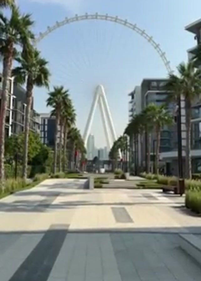 wide pathway with alternating rows of light grey and dark grey concrete blocks. Rows of palm trees line both sides of the pathway, and buildings are visible behind them. In the distance, a large Ferris wheel with a white, A-shaped support structure stands against a clear, blue sky. The scene appears to be empty of people.