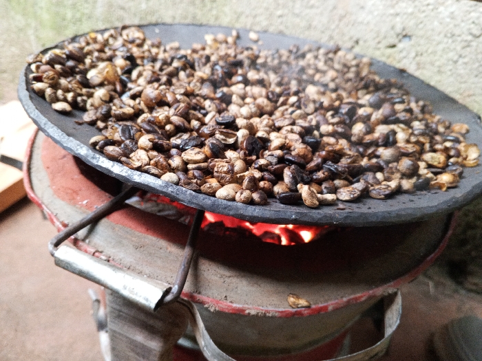 In Borabu Chitago ward, Kenya, a close-up image depicts a quantity of coffee beans undergoing the roasting process