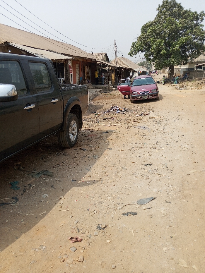 A dirt road is lined with dilapidated shops, some occupied, under tin roofs. A black pickup truck is parked on the left. To the right, a maroon sedan has its driver-side door open. Litter is strewn across the road. A large tree provides shade further down the road, where several people sit and stand near buildings. Overhead, power lines traverse the scene. The sky is overcast.
