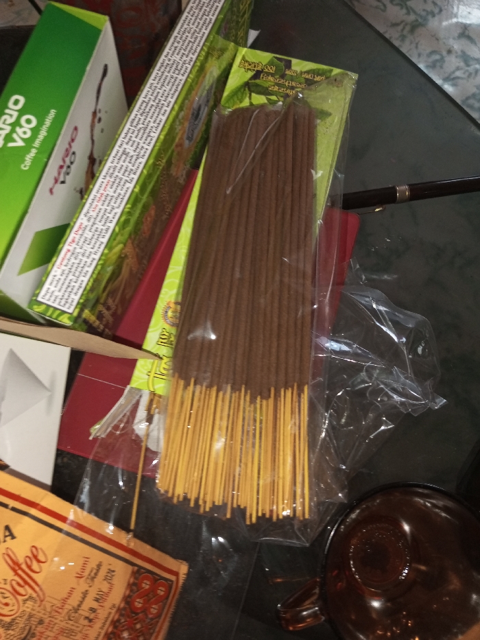 The image features a collection of items including a HARIO V60 coffee maker box, a box of incense sticks, a pack of incense sticks in plastic packaging, a coffee bag with Malay language text, and a brown glass cup