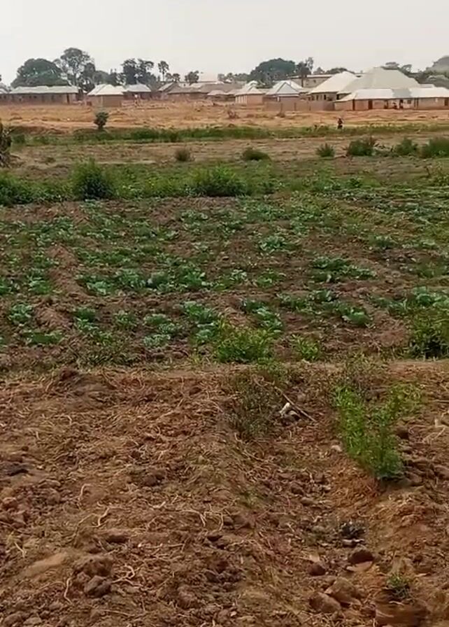 The camera shows a scene of a farm. In the foreground is brown soil with straw. Beyond the soil is a field of cabbage plants in rows. In the background are buildings. There are also a few people walking in the background. The sky is grey and overcast.