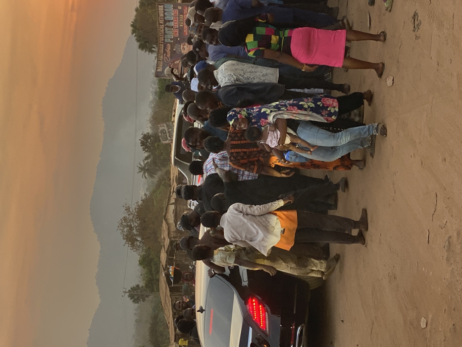 A large crowd surrounds a black car on a dirt road, near a mountain range. The crowd is a mix of ages and attire. Some people are wearing colorful dresses, jeans, and patterned shirts. A woman in the crowd holds a baby. In the background, there is a sign, some trees, and the sky. The image has warm tones, possibly from the light of the setting or rising sun. The overall atmosphere seems to be busy and potentially celebratory.
