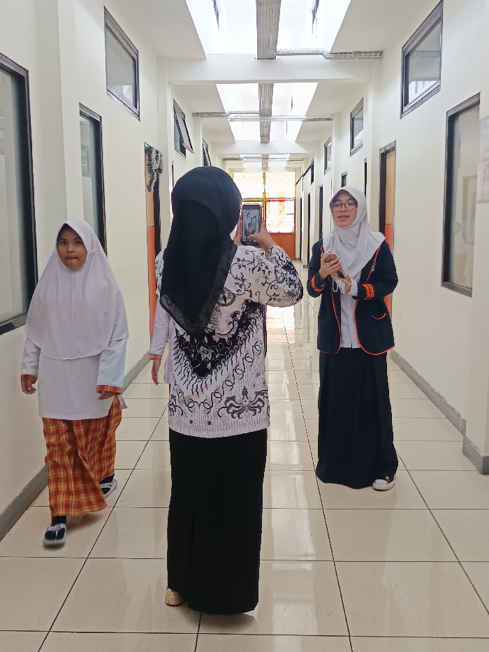 In a brightly lit hallway, three females stand. On the left, a young girl in a white head covering and orange patterned pants walks towards the camera. In the middle, a woman with a black headscarf holds a smartphone, presumably taking a picture of the third female. The third female wears glasses, a white head covering, a navy blazer with orange trim, and a long navy skirt. The hallway features windows and doorways along the walls, with a skylight above.