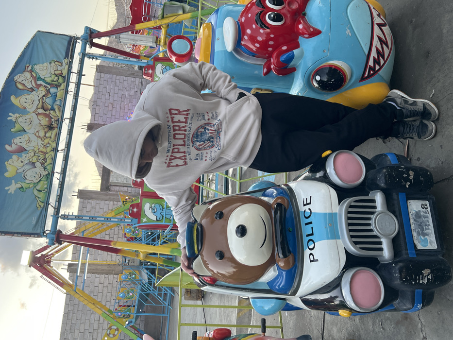 This image depicts an outdoor amusement park setting in Barza Municipality, Syria, during late afternoon or early evening, characterized by soft natural light and a partly cloudy sky with sunset hues. A lone individual, appearing to be a young male, stands slightly right of center, wearing a light beige hooded sweatshirt with the hood up, black pants, and dark athletic shoes. The sweatshirt features a graphic reading "WESTERN EXPLORER WILD HORSES RACE" with additional text and an American flag motif. The individual's left hand rests on the head of a children's coin-operated ride shaped like a black police car with blue and white stripes and a brown cartoon bear figure in a police hat, labeled "POLICE" on the front and "SERGNO M-B-168" on a lower plate. To the individual's right is another children's ride, a light blue cartoon shark or fish with a red octopus figure attached to its head. In the background, a large amusement park pendulum or "pirate ship" ride with yellow and red metal structures is visible, above which a banner displays cartoon characters resembling Snow White and the Seven Dwarfs. Behind the rides and a metal railing, structures constructed from concrete blocks, some appearing unfinished, are present, with hilly terrain discernible in the far background. The individual is positioned with legs crossed at the ankles, looking downwards and to their left, with their right hand in a sweatshirt pocket.