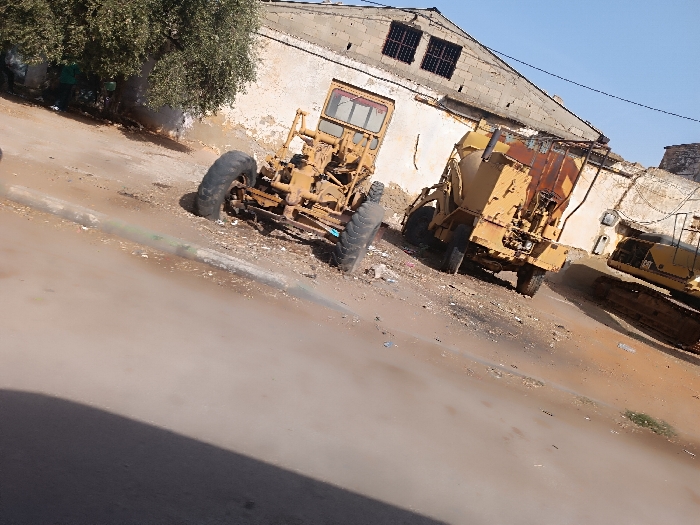 The image displays a neglected industrial or storage area in Meknes, Morocco. The lower portion of the frame shows a light-colored road surface, partially covered by a large dark shadow in the foreground. A faint green line delineates the road from a dusty, uneven dirt and gravel shoulder. Three large, yellow construction vehicles are positioned on this shoulder, exhibiting significant weathering, rust, and dirt. From left to right: a road grader with a visible cab and large front tires is parked, facing left; behind it, a rear-facing vehicle, likely a concrete mixer or front-end loader, is situated; and further right, partially obscured, is an excavator or bulldozer with visible tracks. In the background, a dilapidated, light-colored industrial building features a gabled roof and two high-set, barred windows. A large tree with green foliage is visible in the upper left background. The ground throughout the scene is dry, dusty, and strewn with various debris. The sky is clear and blue, indicating daytime. No individuals are present, and no active operations are occurring. The precise location within Meknes cannot be determined from the visual information; however, the scene is consistent with an industrial zone or a heavy equipment storage yard.