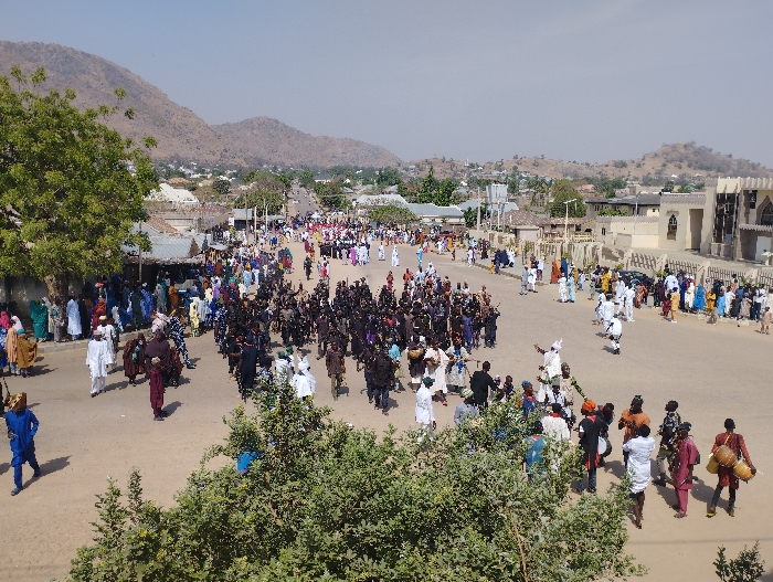 large crowd of people gathered on a wide, paved street in Kaltungo, Nigeria
