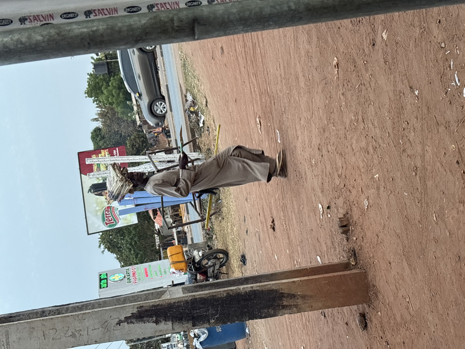 An elderly man in traditional attire sits on a makeshift chair on a dirt ground next to a road