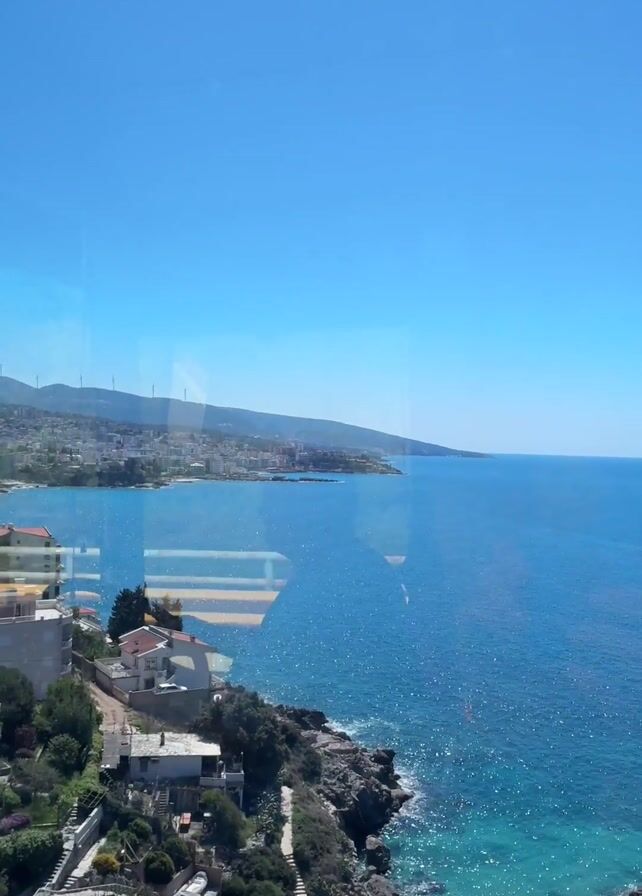 view of a coastline from the window of a moving vehicle, likely a bus or train. The camera is positioned inside the vehicle, looking out through the window. A coastal town is visible in the distance, with buildings and a mountainous backdrop. The sea is a vibrant blue with visible sunlight reflecting off its surface, creating a shimmering effect. The foreground includes rocky cliffs covered with greenery and a few houses with red roofs. A light contrail is visible in the upper right part of the sky. The vehicle’s interior details are visible, including a metal handrail and parts of the window frame. The vehicle is moving smoothly. The overall impression is of a scenic coastal journey on a bright, sunny day.
