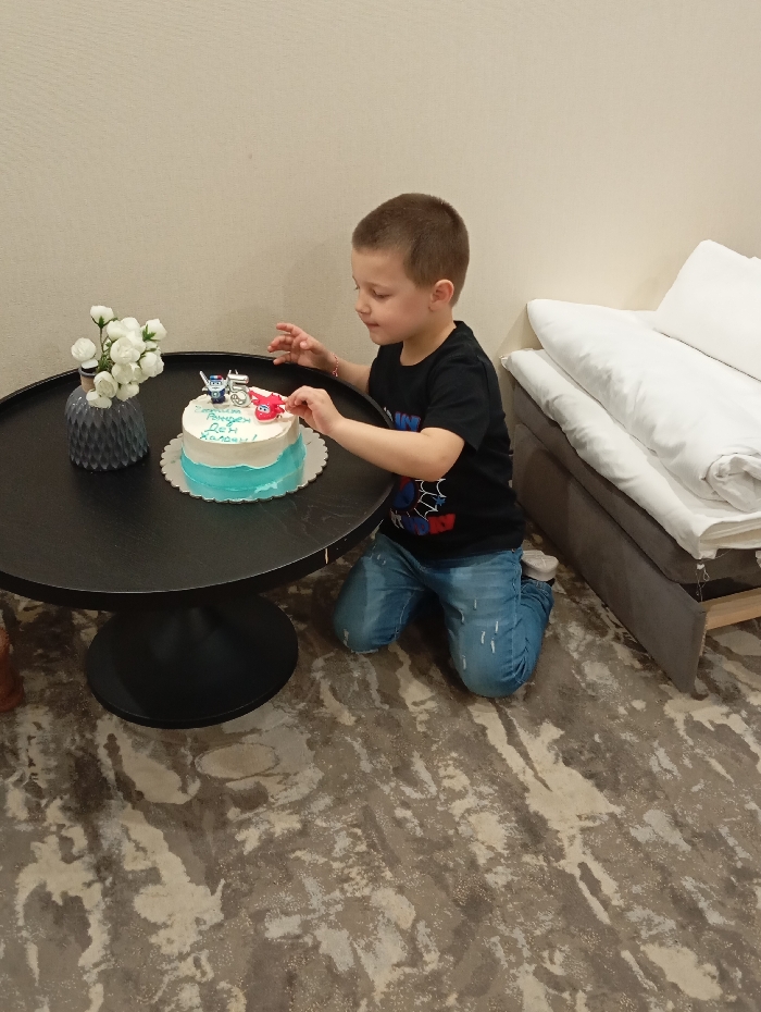 The scene depicts an indoor room located in the city of Hisarya, Bulgaria. A young male child, appearing approximately 5-7 years old, with short brown hair, kneels on a multi-toned patterned carpet featuring shades of brown, gray, and beige. He wears a black t-shirt with a graphic design and distressed blue jeans. His focus is directed toward a small, round birthday cake placed on a black, circular table. The cake features white and light blue frosting, decorated with a number '5' candle, a blue robot figure, and a red airplane figure as toppers. The cake's surface displays Cyrillic text, reading "Честит рожден ден Калоян!" (Happy birthday Kaloyan!). The child's right hand is positioned near the red airplane topper, appearing to adjust or place it. Adjacent to the cake on the table, a dark gray, faceted vase contains several white artificial flowers. To the right of the kneeling child, a gray upholstered bed frame or daybed is partially visible, topped with a stack of neatly folded white linens and pillows. The room's wall is a uniform, plain light beige.