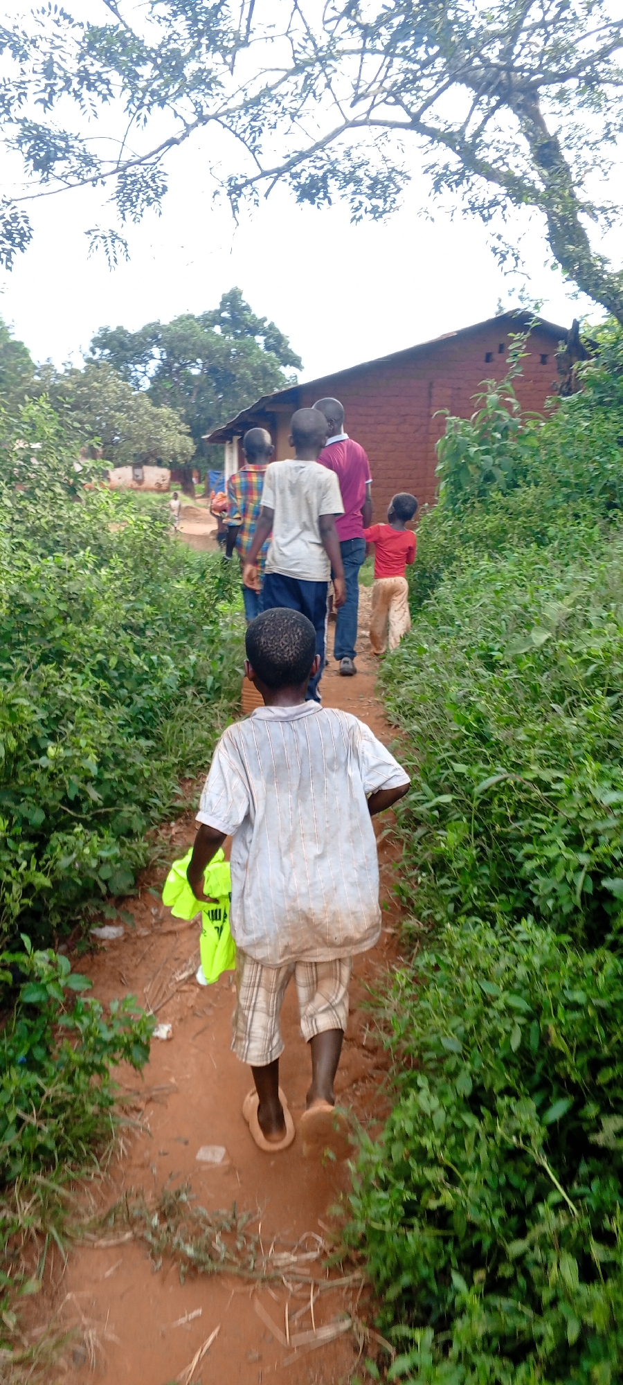A group of people, mostly children, are walking away from the viewer down a narrow dirt path, bordered by dense green foliage. The path leads towards a rural building constructed of red brick in what appears to be a residential area on the outskirts of the city of Ngalula, Democratic Republic of the Congo. The closest person to the viewer, a young boy, is wearing a striped shirt, plaid shorts, and slip-on sandals, and carrying a crumpled yellow bag. Behind him are four other figures, each progressively further away. These are individuals are also walking down the path towards the building. One of the figures is wearing a red shirt. The background includes trees and a cloudy sky. A building is partially visible to the left of the group.