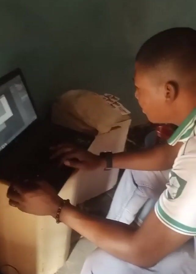 A person with short hair is sitting cross-legged on the floor using a laptop. The laptop is positioned on top of a cream-colored cylindrical object. Behind the laptop are some bags and papers. The person is wearing a white shirt with green trim and blue jeans. They are typing on the laptop. The wall behind them is a dull green.