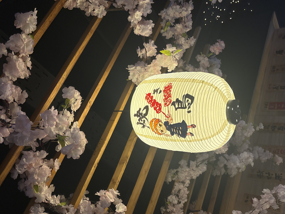 The image displays an upward view of an indoor establishment in Gentilly, France. A large, illuminated, cylindrical paper lantern hangs centrally from a dark ceiling. The lantern features an anime-style character with orange hair and a dark robe, holding a skewer with red objects, accompanied by black Japanese kanji "焼き鳥" (yakitori) and red text, including "CHICKEN". The ceiling is structured with horizontal wooden beams, around which artificial light pink cherry blossom garlands are draped. The scene is dimly lit, with faint, diffuse decorative lights visible in the upper right background. Portions of wooden panels with additional Japanese script are visible in the lower background, suggesting a themed restaurant or venue.